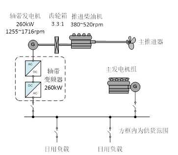 賽思億為南峰01散貨船提供的軸帶發(fā)電系統(tǒng),采用中速機(jī)自由端連接齒輪箱的連接方式,帶動軸帶發(fā)電機(jī)通過賽思億自主研發(fā)的AFE有源前端變頻器輸出穩(wěn)頻穩(wěn)壓質(zhì)量穩(wěn)定可靠的電源,利用主機(jī)冗余功率發(fā)電,以滿足船舶航行過程中全船的用電負(fù)荷,并關(guān)停主發(fā)電機(jī)組,達(dá)到節(jié)約燃油消耗、降低船舶運(yùn)行成本的目的。
