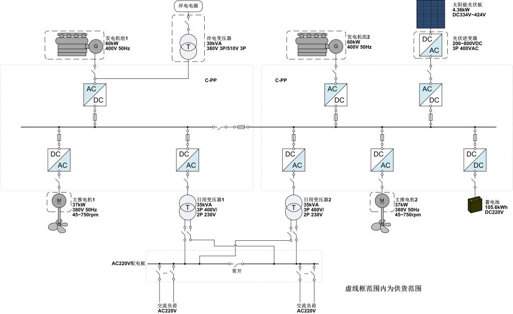 批量四海風(fēng)行豪華游艇,整個動力系統(tǒng)配置2臺60kW的柴油機(jī)組、一套4.6kW的太陽能光伏板、一組105.6kWh的蓄電池組和2臺37kW的主推進(jìn)電機(jī)。在觀光工況下,發(fā)電機(jī)組停止工作,使用蓄電池和太陽能為全船供電,可使用蓄電池組連續(xù)推進(jìn)5小時左右,零排放、振動噪音小并且船員舒適性較好。