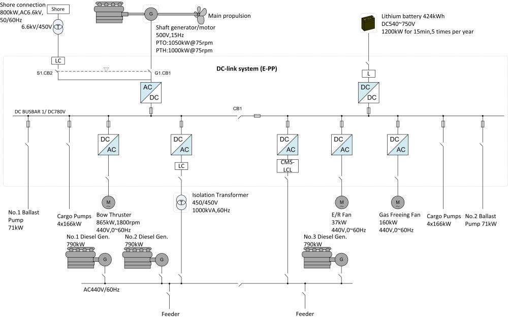 鼎衡15000噸化學品船,船舶總長147米,型寬22米,入級BV船級社,抱軸電機額定功率為1000kW,同時配置424kWh電池達到削峰填谷的目的,該船舶混合動力系統(tǒng)采用直流組網(wǎng)形式,將主機、發(fā)電機組、電池動力整合并高效分配,為用戶提供高效、綠色、可靠的混合動力。將于2021年年初完成安裝調(diào)試。
